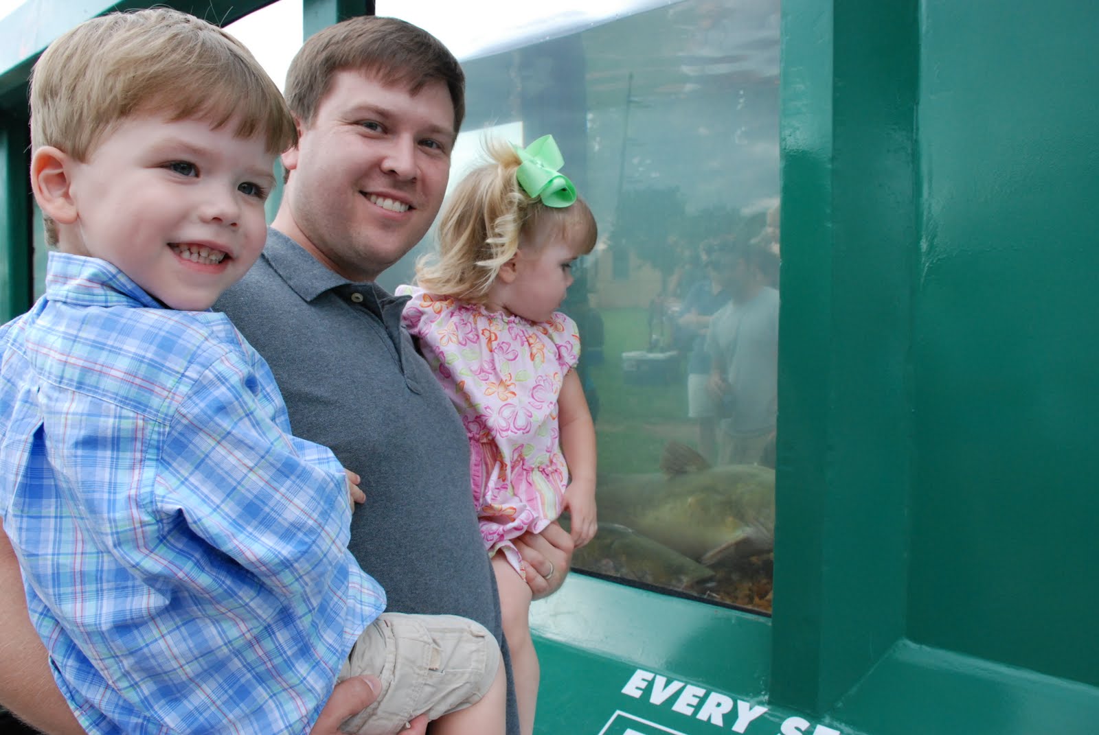 Every year that we have lived here, my dear sweet hubby has wanted to go back to my "Pauls Valley roots" and watch the catfish noodling weigh-in. This year, we spontaneously decided to drive south and see the 80+ lbs. creatures ripped out of their pond nests by some poor souls' bare hand. I think Abigail was afraid one would eat her. Best people-watching event in the state. Anybody wanna join us next year??